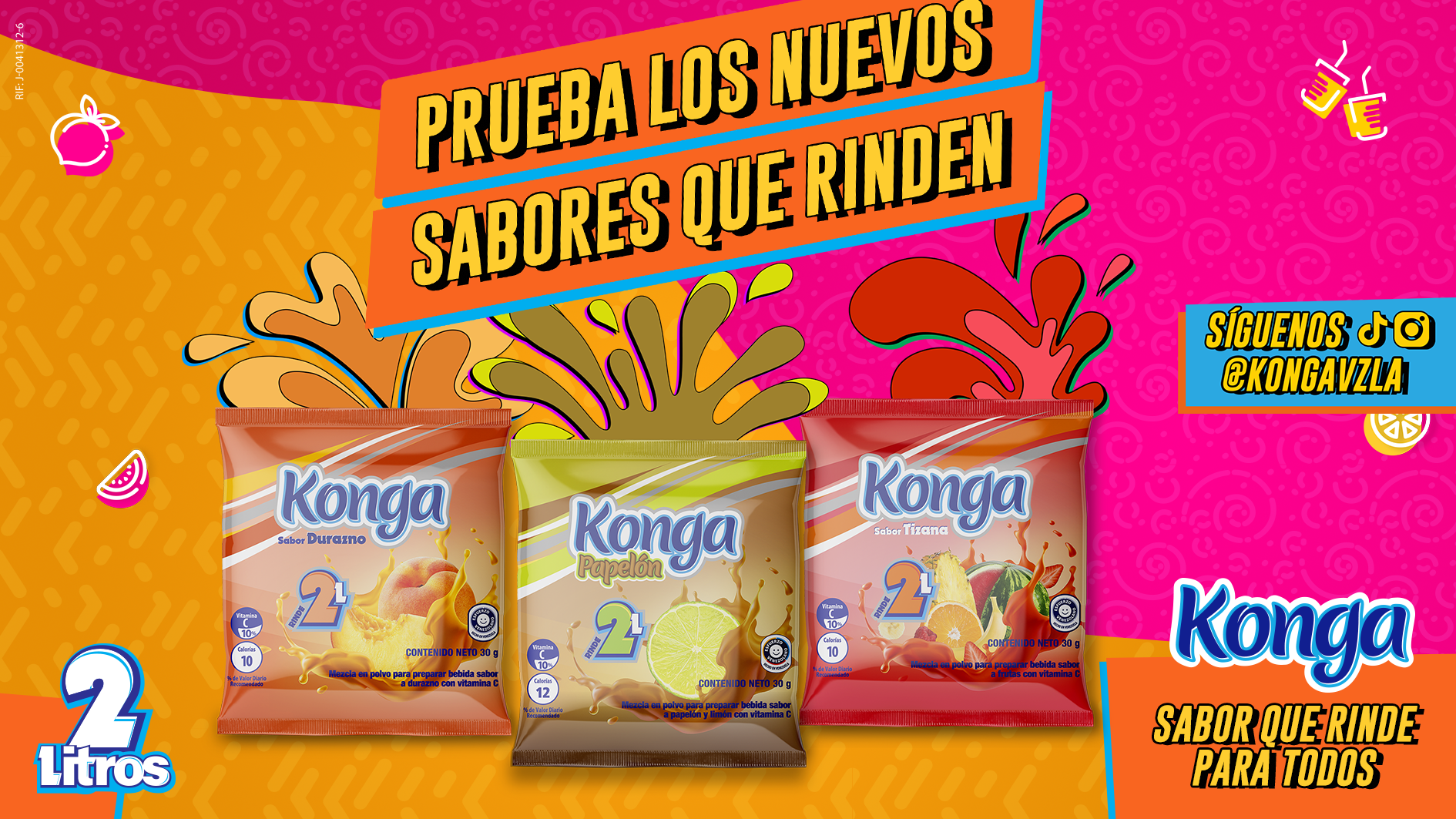 Con la incorporación de las nuevas presentaciones, ahora son siete los sabores que ofrece Konga a sus consumidores: tizana, durazno, papelón, limón, naranja, mora y parchita; todos en empaques de 30 gr, que rinden hasta 2 litros.